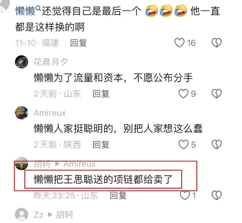 王思聪和懒懒的感情近况,外界猜得没停过!俩人小半年没一块现身,王思聪又总带着不同女生出门游玩,任谁看了都会琢磨,这关系是不是已经散了。 他本就爱张扬,身边总围着年轻靓丽的网红,自身辨识度又高,稍不注意就被拍,网上各种猜测自然越传越凶。后来 “懒懒在二手平台转卖男方送的项链” 登上热搜,更是让大家笃定这段感情已落幕 —— 毕竟不少人分手后会处理前任礼物,既能断念想,还能换点钱,确实算务实的选择。